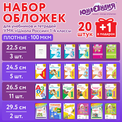 Состав набора: обложки 225х380 – 3 шт., обложки 245х380 – 5 шт., обложки 265х460 – 11 шт., обложки 295х470 – 2 шт.