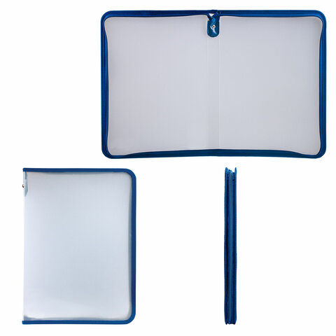 Папка на молнии BRAUBERG предназначена для комфортного хранения и транспортировки документов, тетрадей, различных мелких предметов. Незаменима в работе, учебе, в командировках, путешествиях и деловых поездках.Изготовлена из прочного прозрачного матового пластика толщиной 0,5 мм с диагональной фактурой. Формат А4 (325х230 мм). Надежный замок-молния защищает документы от механических повреждений, а также пыли и влаги. Цвет молнии - синий.