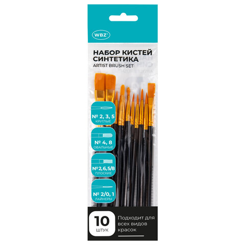 Кисти набор 10 шт., синтетика, черные, № 2/0-8 (Круглые; Овальные; Плоские; Лайнеры), WBZ (ВБЗ), 201
