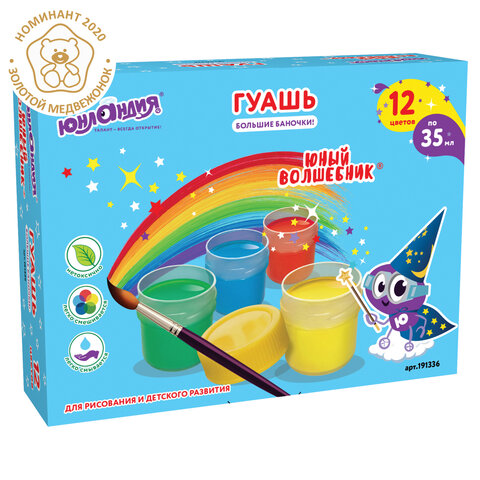 Гуашь ЮНЛАНДИЯ "ЮНЫЙ ВОЛШЕБНИК", 12 цветов по 35 мл, БОЛЬШИЕ БАНОЧКИ, высшее качество, без кисти, 19 отзывы