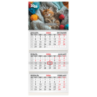 Календарь квартальный на 2026 г., 3 блока, 3 гребня, бегунок, мелованная бумага, BRAUBERG, "Котенок"