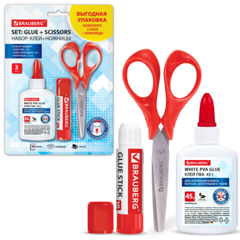 Набор: клей + ножницы BRAUBERG (клей-карандаш PVP 10 г, клей ПВА 45 г, ножницы 13 см), блистер, 2719
