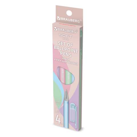Ручка шариковая BRAUBERG "SOFT PASTEL" нежных пастельных оттенков – незаменимый спутник для ведения записей во время учебы или работы.Набор включает в себя 4 шариковые ручки в нежных пастельных оттенках: небесно-голубой, мятный, розовый и сиреневый. Имеет стандартный наконечник диаметром 0,7 мм, который создает линию письма 0,35 мм. Круглая форма корпуса в сочетании с покрытием SOFT TOUCH обеспечивают комфортный процесс письма. Благодаря синему цвету чернил ручка универсальна для школы, университета и офиса.