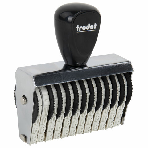 Нумератор TRODAT предназначен для нумерации коробок, документов, бланков, конвертов, квитанций, накладных.Надежный металлический корпус обеспечивает прочность конструкции. Ручки эргономичной формы делают нумератор удобными в эксплуатации. Имеет специальные колёсики для выставления номера. Для использования необходима настольная штемпельная подушка. Набор номера производится вращением колесиков. Содержит пробелы, точки, слэш, прочерк.