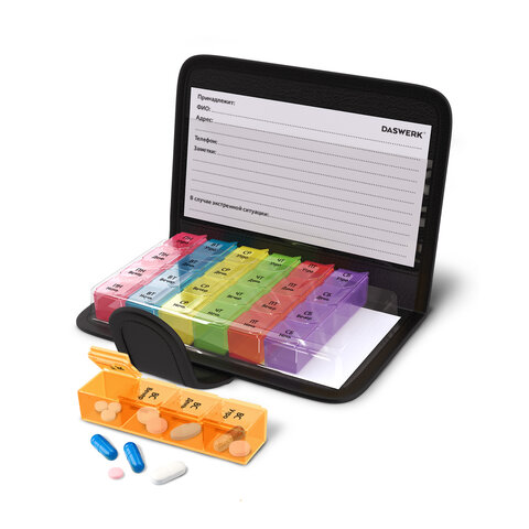 Таблетница DASWERK предназначена для надежного хранения лекарств, витаминов и пищевых добавок. Контейнер из легкого и прочного пластика, а также удобный чехол на кнопке, гарантируют удобство и безопасность в использовании.Таблетница представляет собой 7 съемных ежедневных контейнеров, каждый из которых разделен на 4 отделения: утро, день, вечер, ночь. Это позволяет носить с собой как всю таблетницу в удобном и стильном чехле с застежкой, так и отдельные, более компактные, контейнеры на один день. Дома, на работе, в путешествии - упорядоченный прием лекарств и витаминов станет проще с таблетницей-органайзером.