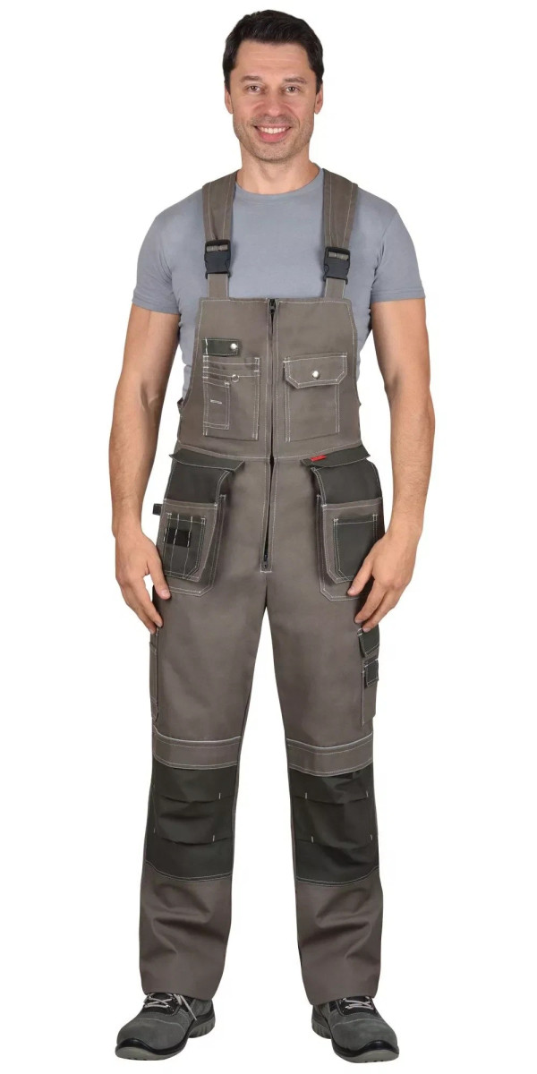 Полукомбинезон выполнен из ткани "Канвас Комфорт", прямого силуэта, с центральной застежкой на тесьму – «молния» R-вида, с различными многофункциональными карманами, с кулисой по спинке на резинку ткацкую, с объёмными наколенниками и бретелями регулируемыми резинкой помочной и фастексам. В полукомбинезоне вшивается кант СВ 3 мм светоотражающий 100 К для обозначение сигнальной видимости.
