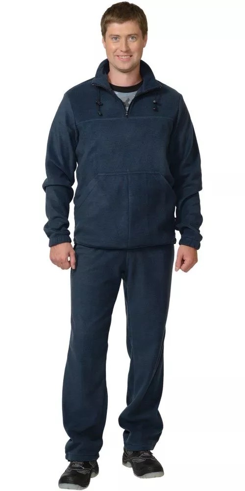 Джемпер со шнуром по воротнику-"стойке" и низу, резинкой по низу рукавов, большим карманом спереди. Брюки с резинкой и шнуром.