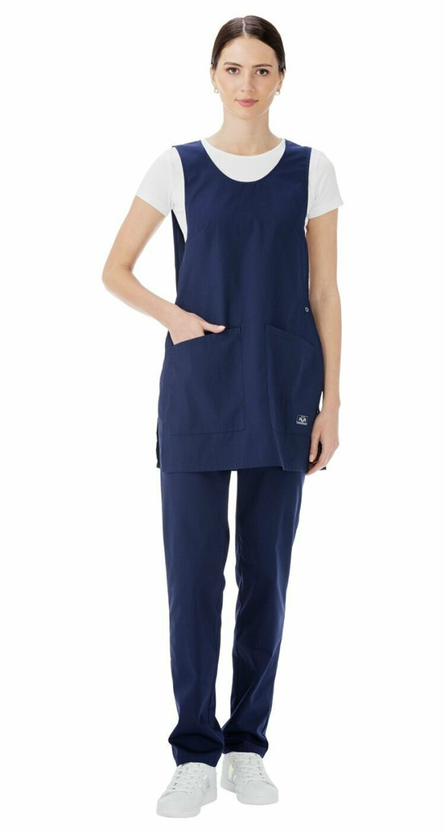 Фартук-сарафан средней длины с U-образной горловиной. Фартук состоит из передней и задней частей, фиксируется с помощью боковых полупоясов. На уровне бедер накладный карманы.