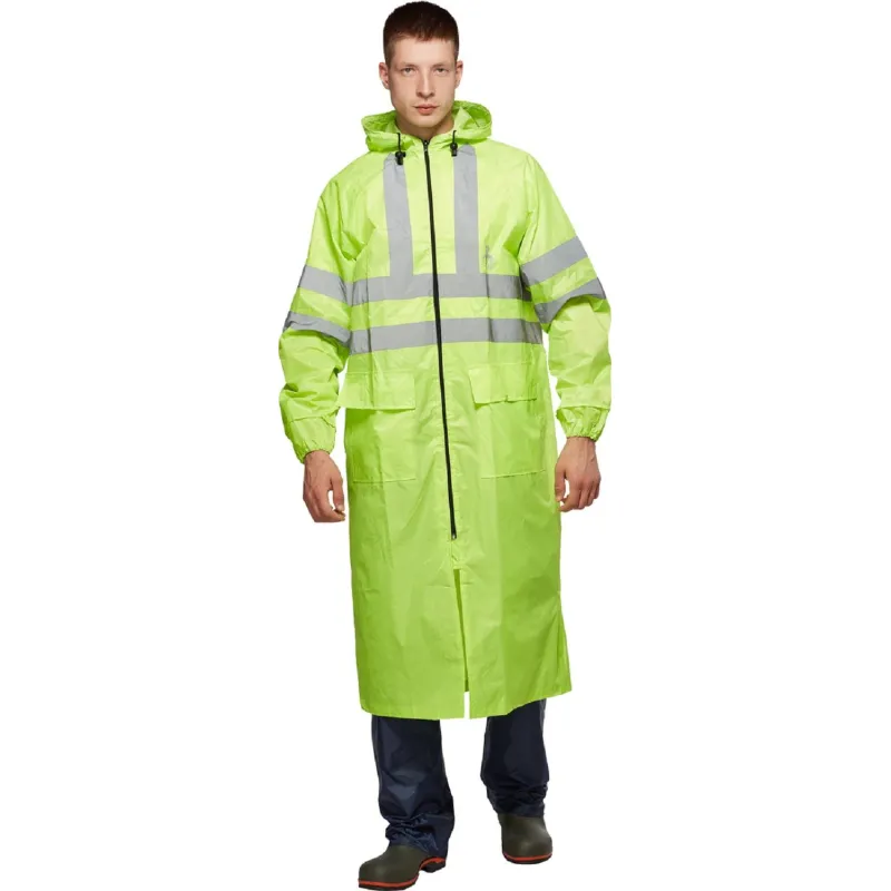 Плащ предназначен для защиты от дождя и других атмосферных воздействий (ветра, пыли) и обеспечения повышенной видимости (сигнальная одежда) носящих ее людей в темное время суток или в условиях недостаточной освещенности. Плащ лимонной расцветки, имеет световозвращающие полосы (СВП) по 3кл, размеры одежды L-3XL